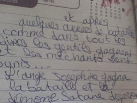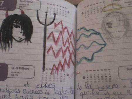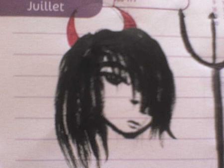 Bon tout à commencé quand on (léa et moi) tombe sur une de mes "oeuvre" ds mon agenda et la je dis a mais elle é horrible c'est un "demon" et c'est là qu'intervin léa (allias fantômette) pour me sortire d ce mauvé pas en lui faisant des cornes de demon, elle est beaucoup plus jolie comme ca non ?